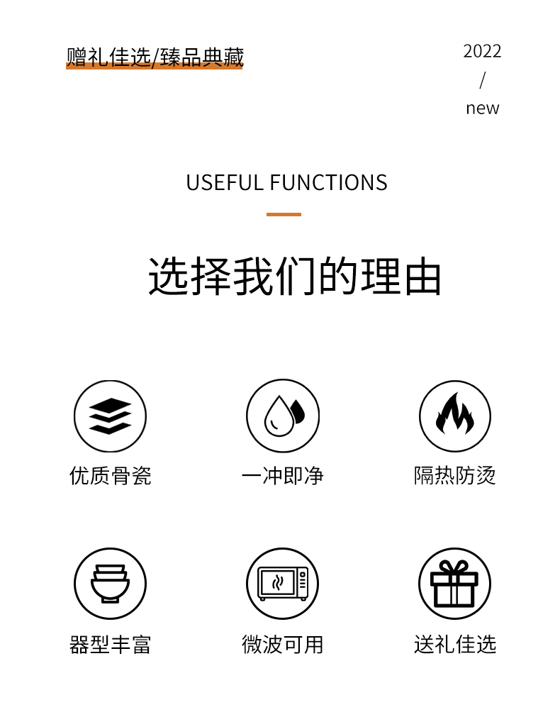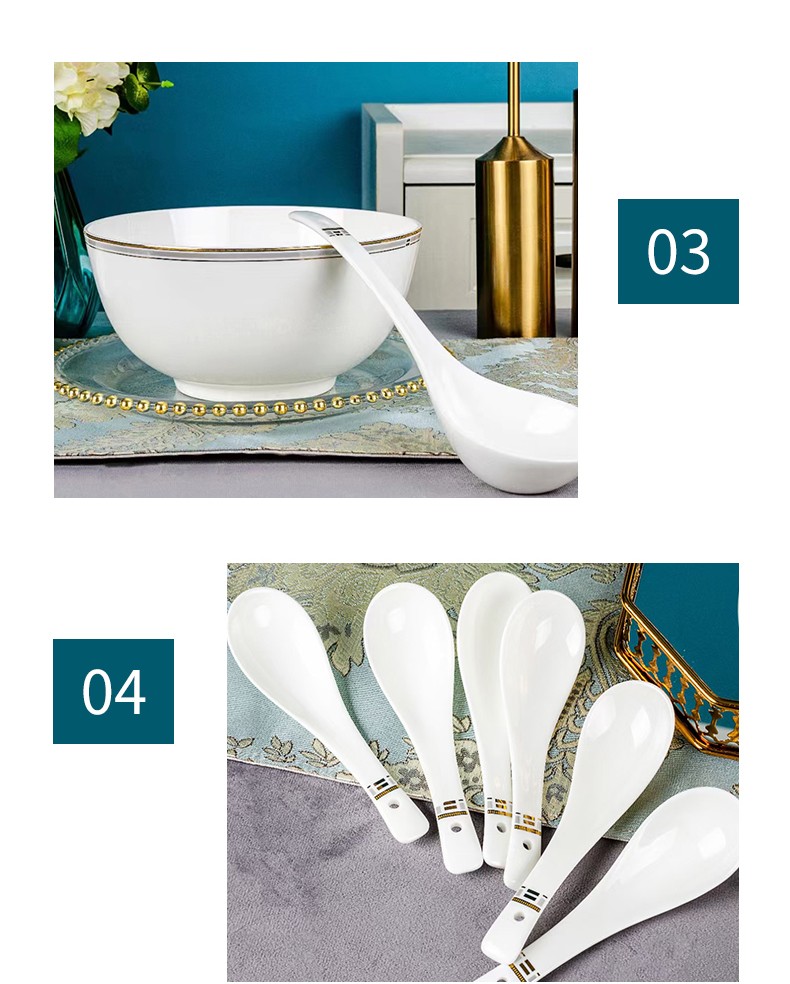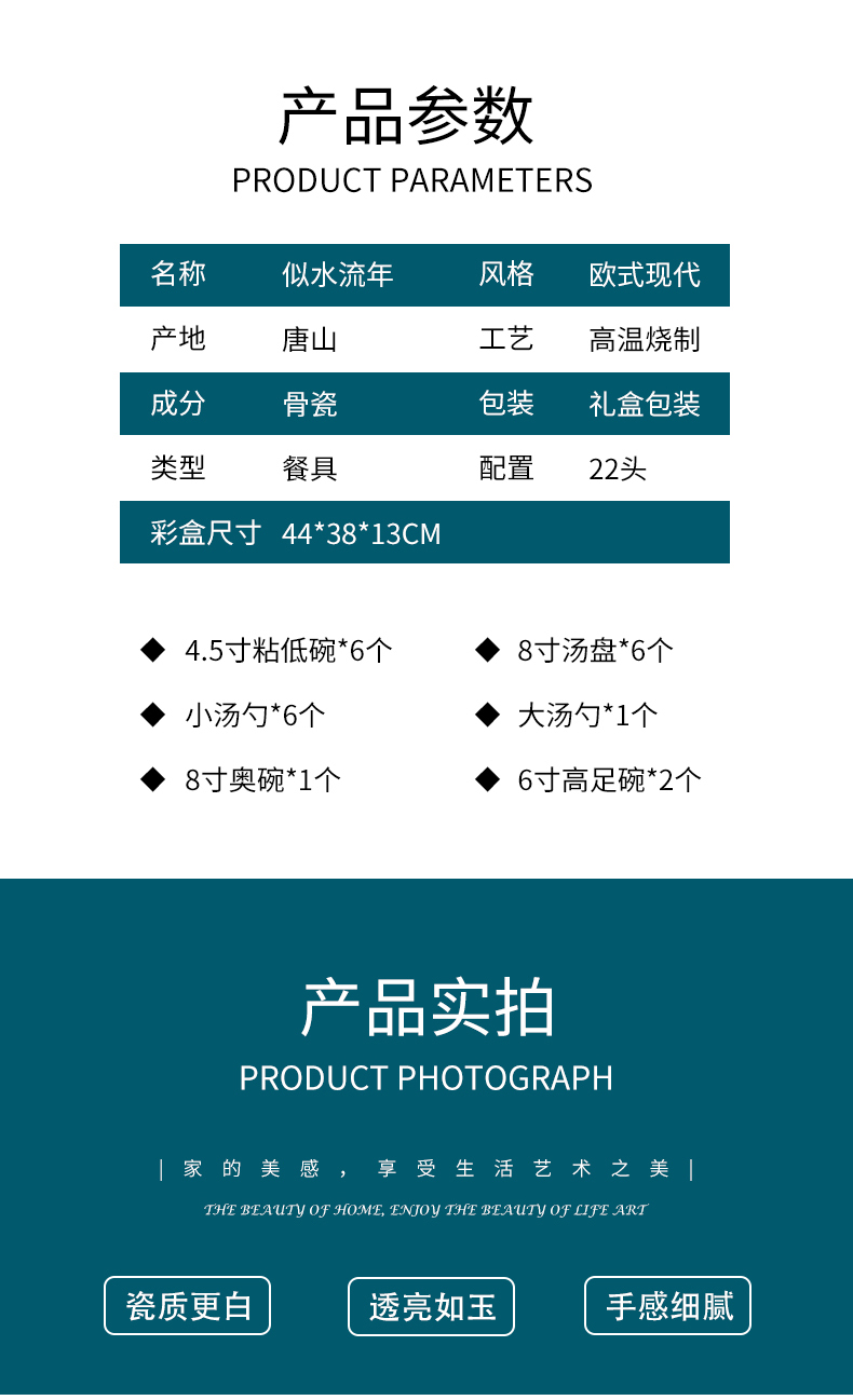 22头 4.5寸粘低碗碗 X 6个 8寸汤盘X 6个 小汤勺 X 6个 大汤勺 1个8寸奥碗X 1个 6寸高足碗 X 2个