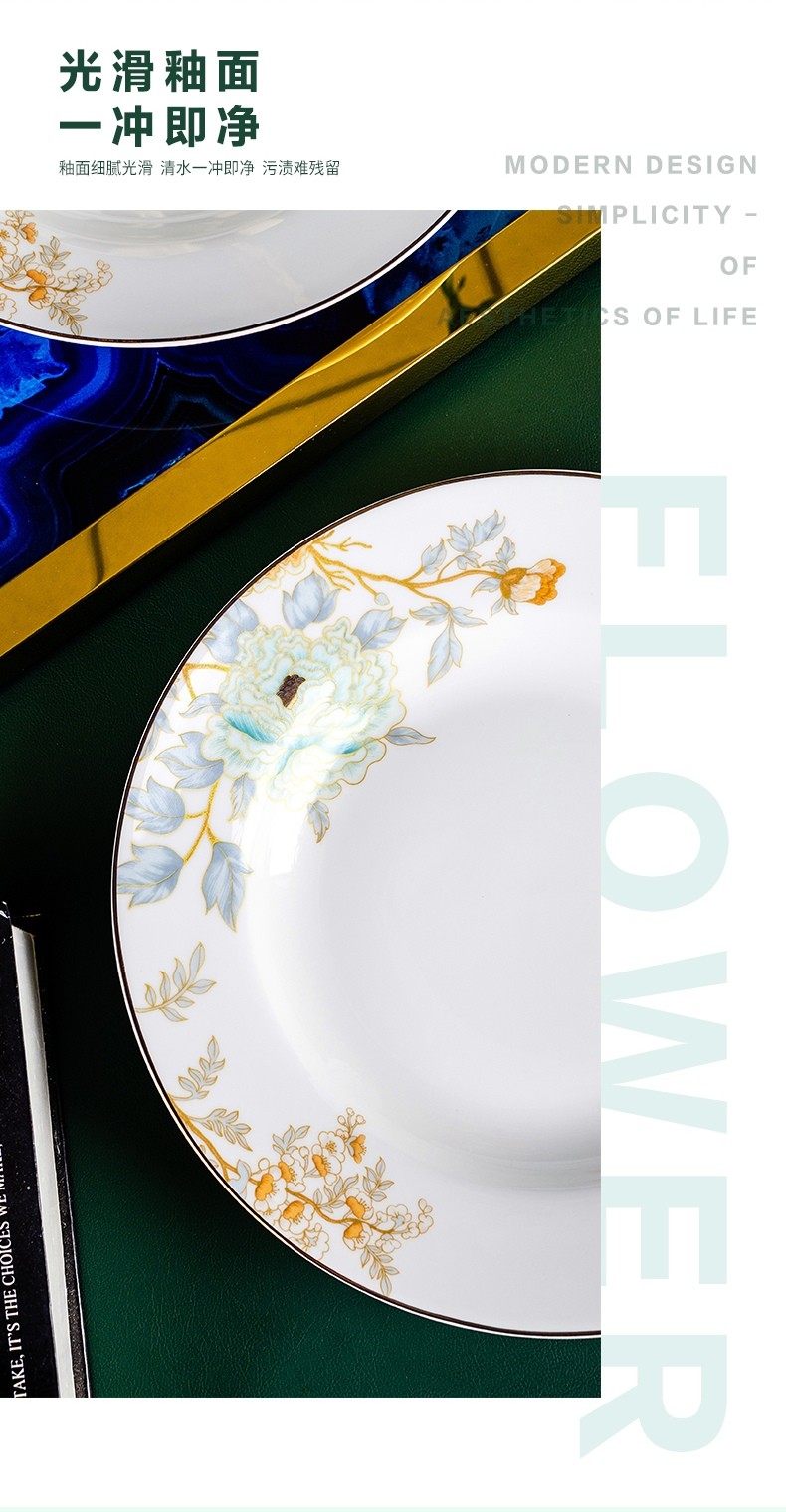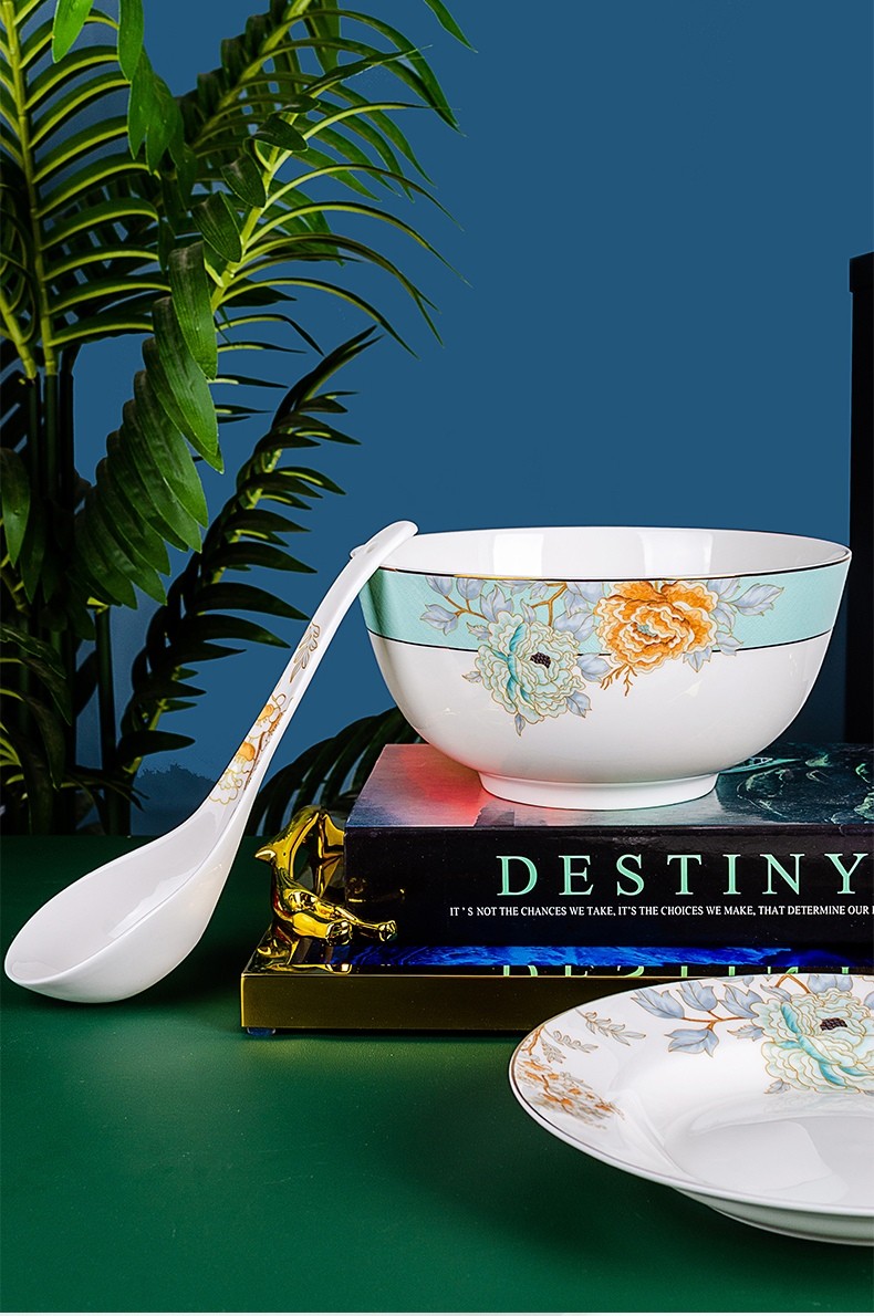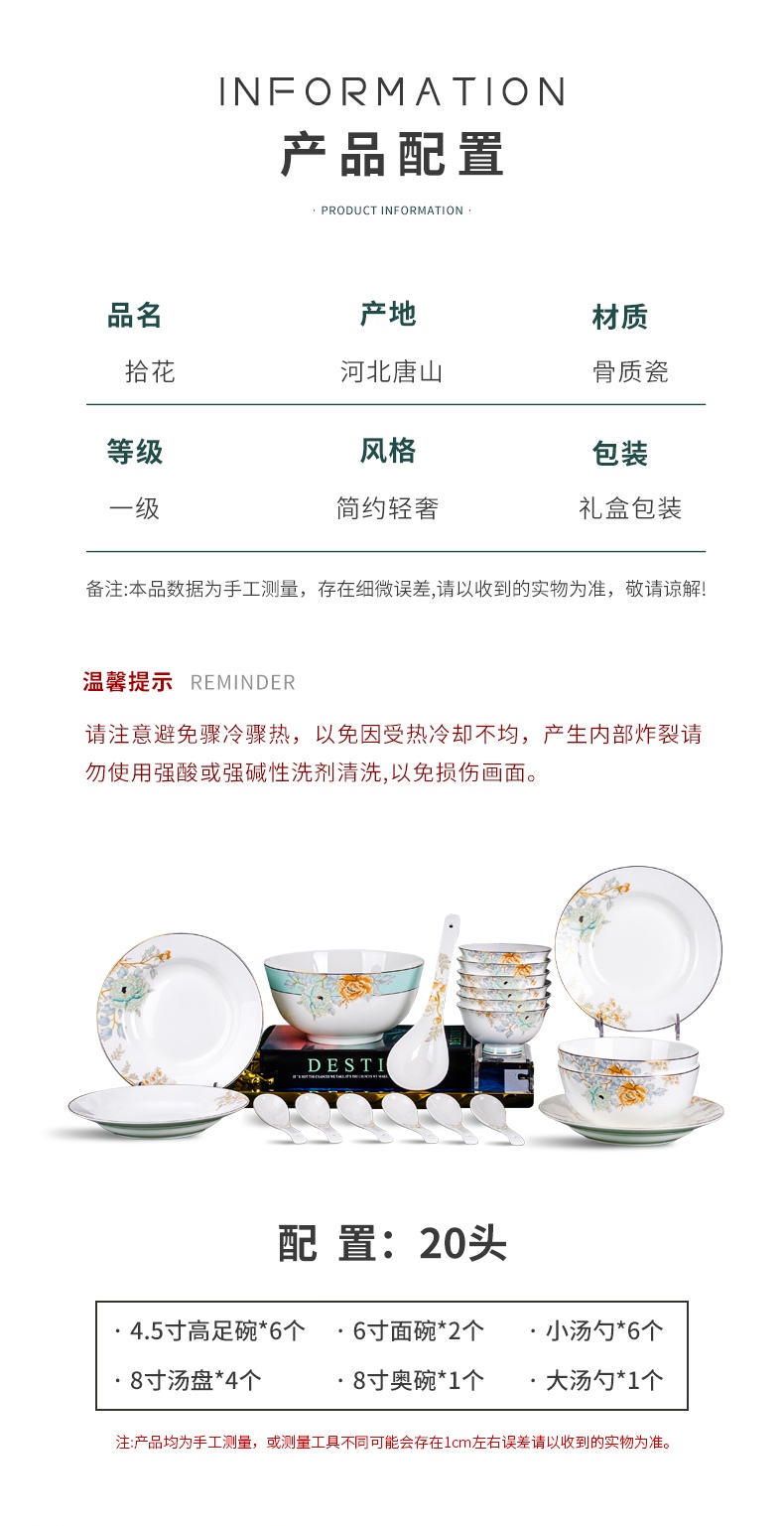 配 置:20头4.5寸高足碗 X 6个 8寸汤盘 X 4个6寸面碗 X 2个 小汤勺 X 6个大汤勺 X 1个8寸奥碗 X 1个