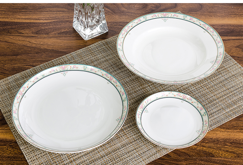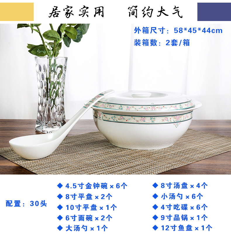 30头4.5寸金钟碗 X 6个 8寸汤盘 X 4个 8寸月光盘 X 2个 小马戈 X 6个 平盘 X 1个 4寸吃碟 X 6个 6寸面碗 X 2个 8寸汤碗 X 1个 大马戈 X 1个 鱼盘 X 1个