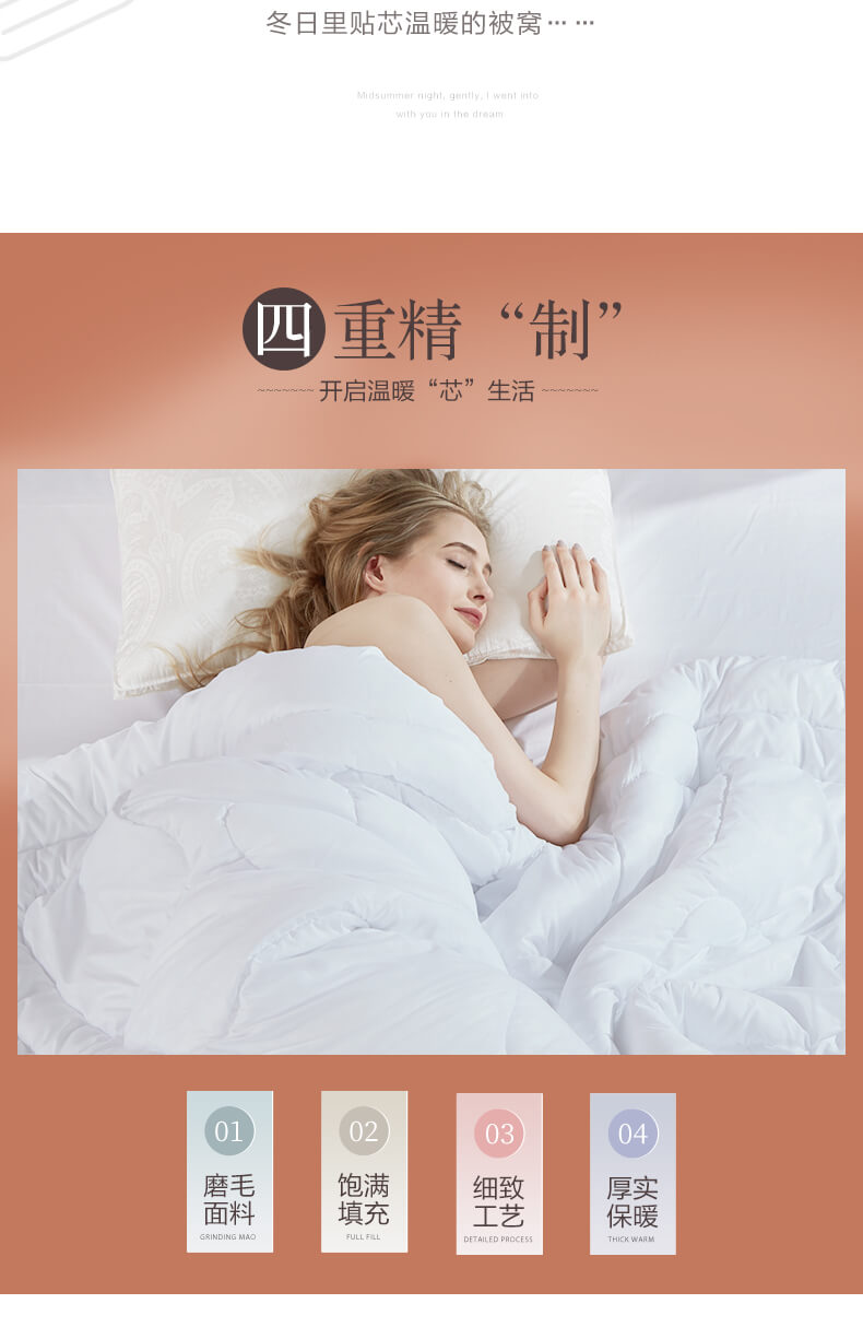 【产品面料】磨毛面料(聚酯纤维)【产品填充】100%聚酯纤维【产品规格】203*229cm(2000g)【产品重量】毛重约3.1kg 净重约2.9kg