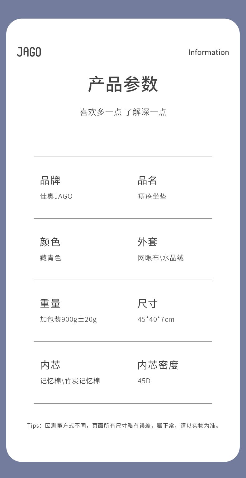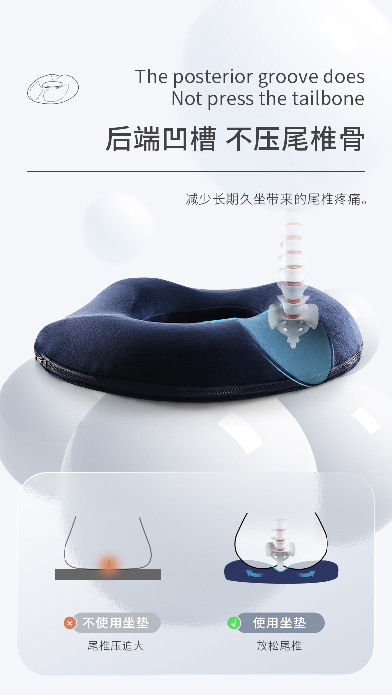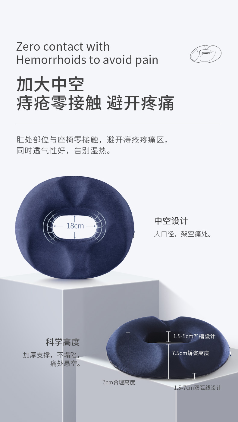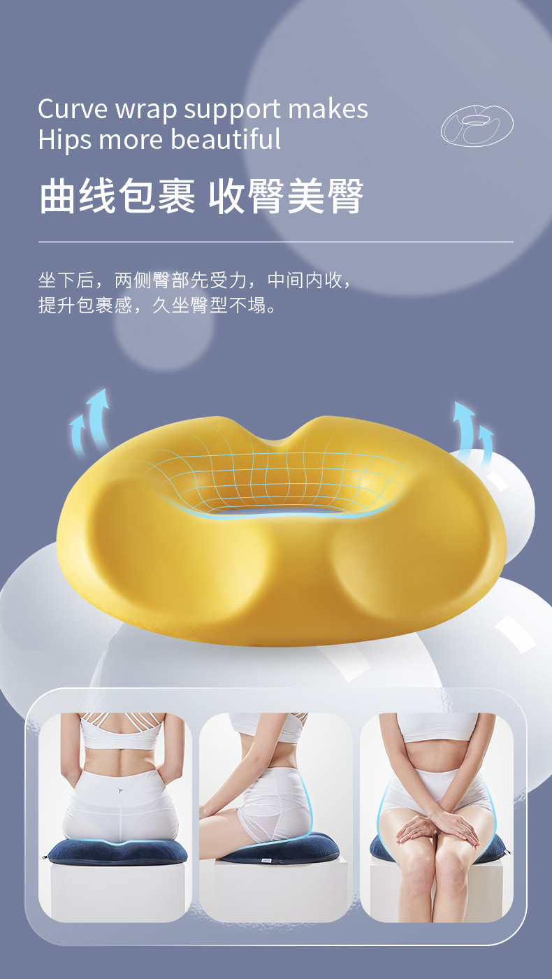 材质:外套-面料1:水晶绒(96%聚酯纤维4%氨纶)面料2:防滑布(100%聚酯纤维)内套-/填充物-100%聚氨酯功能特点:1.加大中空,不压痛处2. 后端内凹,不压尾椎3.双弧下滑,放松双腿 45*40*7CM