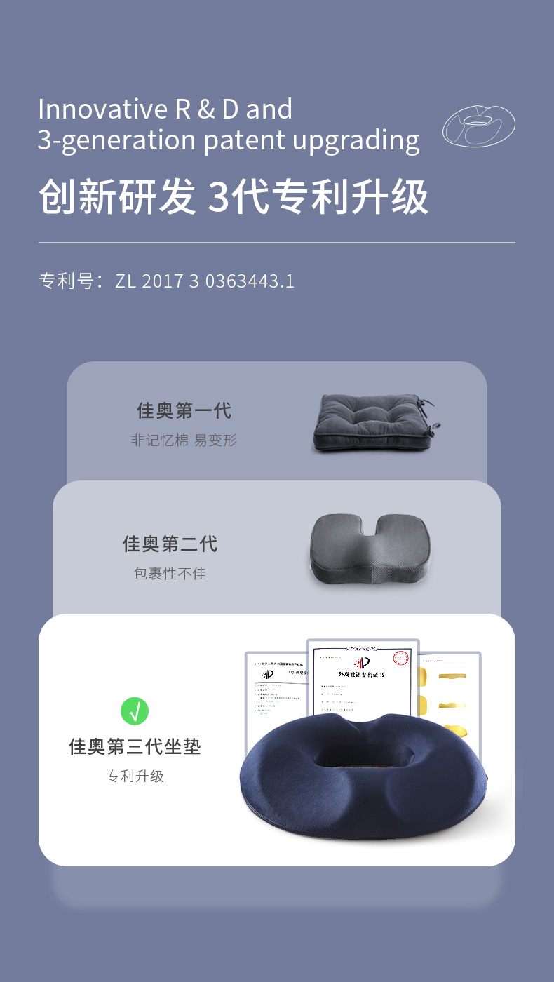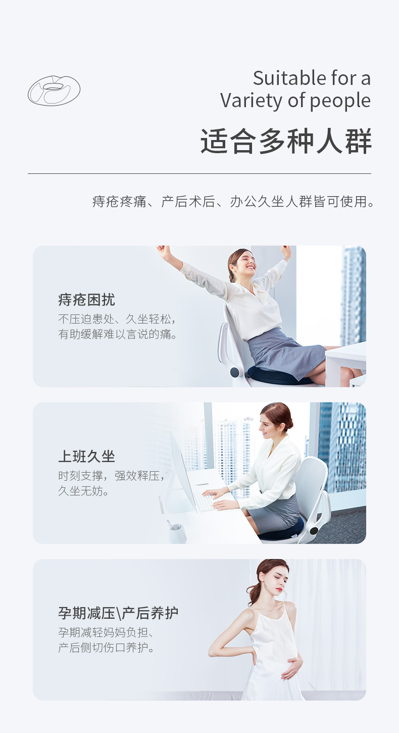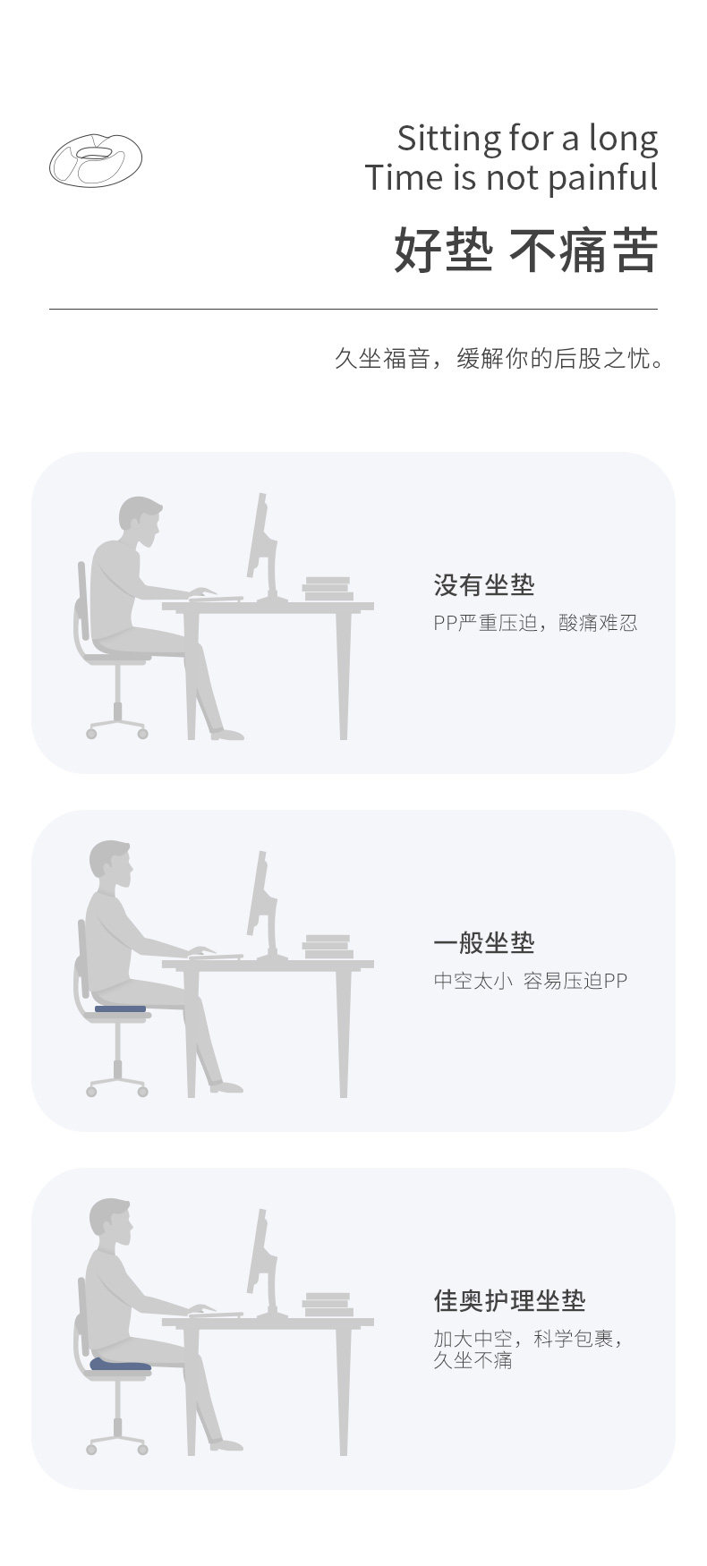 材质:外套-面料1:水晶绒(96%聚酯纤维4%氨纶)面料2:防滑布(100%聚酯纤维)内套-/填充物-100%聚氨酯功能特点:1.加大中空,不压痛处2. 后端内凹,不压尾椎3.双弧下滑,放松双腿 45*40*7CM