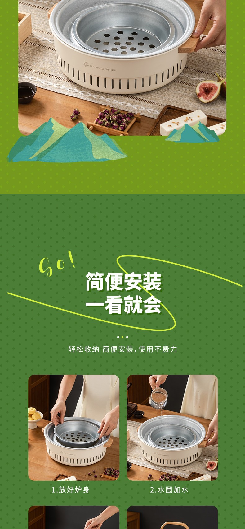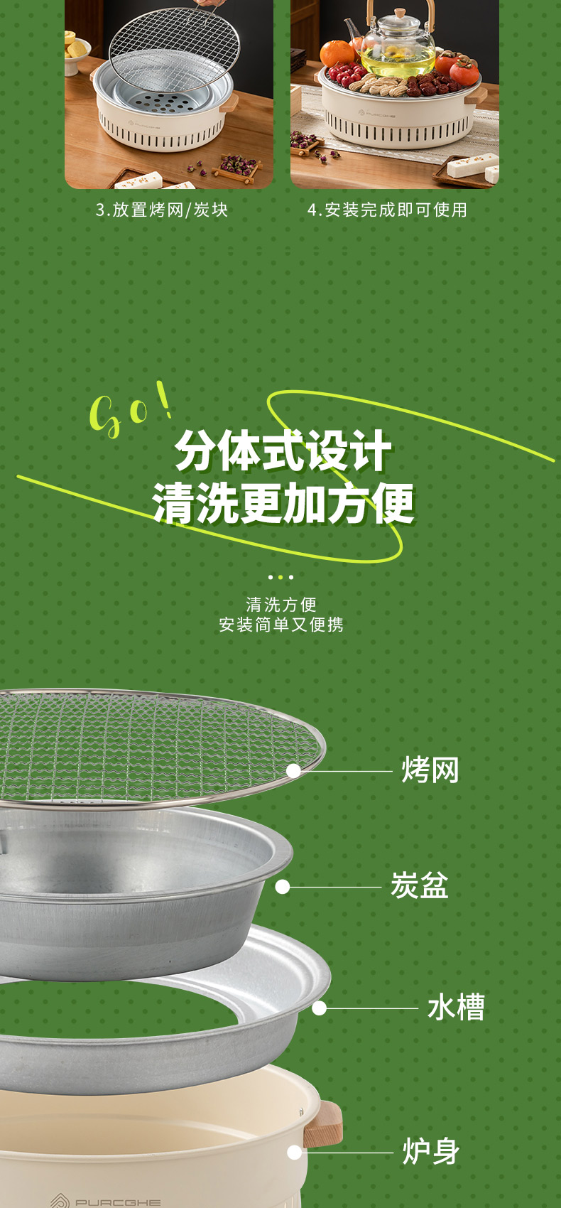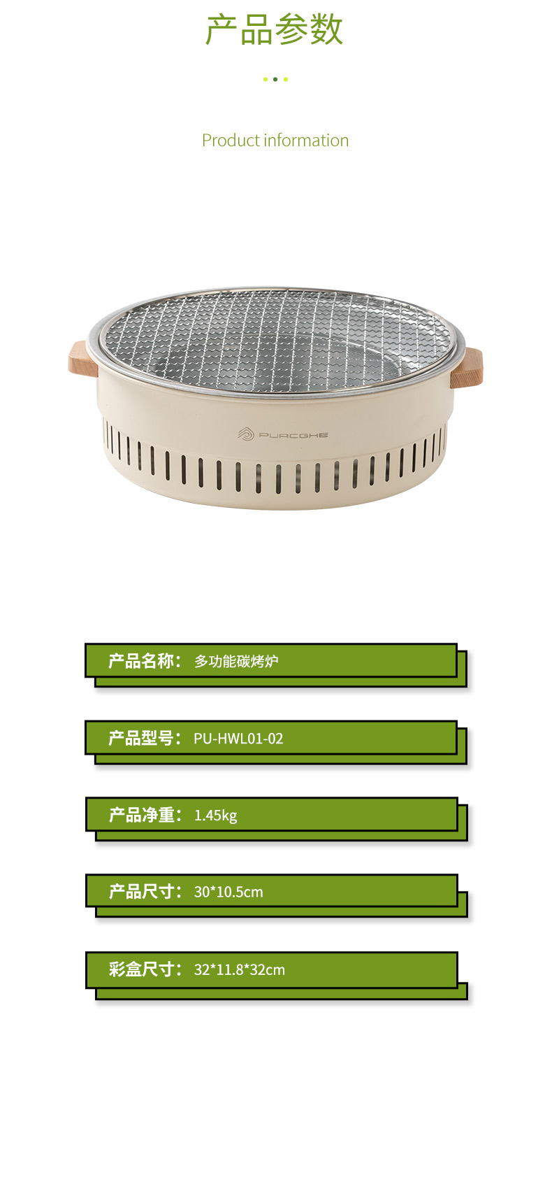 产品尺寸:30*10.5cm彩盒尺寸:32*11.8*32cm外箱尺寸:63*33.5*67.5cm邮购箱尺寸:33*33*13cm装 箱 数:10个/件配 件:烤网、炭盆、水槽、炉身,起网勾产品净重 : 1450g